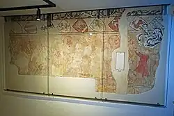 Die Wandmalereien finden sich im Saal und im Treppenhaus im ersten Stock. Die Malereien an der Ostwand über der Treppe gehörten ursprünglich ebenfalls zum Festsaal. Er war fast neun mal neun Meter gross, die drei Meter hohen Wände waren ursprünglich vollflächig bemalt. Es sind nur einige Teilstücke erhalten. Der nördliche Bereich der Ostwand wurde bisher nicht freigelegt.