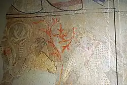 An der Westwand ist eine kleine Jagdszene erhalten, mit einer Falknerin mit Falknerhandschuh, einem Falken und einem jugendlichen Reiter, der im gestreckten Galopp davonreitet. Mit der linken Hand hält er die Zügel, während er mit dem rechten Arm eine Federspiel genannte Beutetierattrappe schwingt, mit welcher der Falke angelockt wird. Die Darstellung wird als Entführung des Falken von seiner Herrin gedeutet und steht symbolhaft für einen untreuen Liebhaber.[9] In der Fortsetzung der Bildergeschichte, getrennt durch Bäume auf einem stilisierten Hügel, ist vermutlich die gleiche Dame in stehender Haltung und daneben die ausgestreckte Hand eines Mannes mit dem Falken zu erkennen. Insgesamt ist jedoch nur ein kleiner Teil der Bilderfolge erhalten geblieben. Die Falkenjagd als Symbol der Minne kommt auch bei vielen Illustrationen der in Zürich entstandenen Manessischen Liederhandschrift vor.[9]