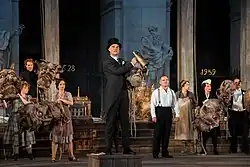 2014 stand im Zeichen der 100-jährigen Wiederkehr der Kriegserklärungen zum Ersten Weltkrieg und beleuchtete das Thema aus höchst unterschiedlichen Perspektiven. Erstmals kam der notorische Hofmannsthal-Verachter und Max-Reinhardt-Gegner Karl Kraus[8] zu Festspielehren: Seine Letzten Tage der Menschheit erlitten zwar – aufgrund der Burgtheaterkrise[9] – einen Regisseurwechsel von Matthias Hartmann zu Georg Schmiedleitner, gelangen jedoch dank des exzellenten Ensembles prächtig.[10]