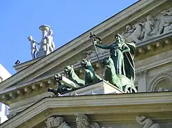 Auf der Laterne der Kuppel über dem Bühnenturm reckte sich die Muse Melpomene, die Personifizierung der Tragödie.[11] Die geflügelte Sphinx auf dem Dachfirst über dem Zuschauertrakt stand für das archaische Griechenland als Ursprung der Tragödie und der europäischen Dichtkunst, als „Allegorie aller Geheimnisse, die das Theater bewahrt und offenbart“.[1] Prunkstück der Fassade war die Bronzegruppe Thalia auf einer Pantherquadriga auf dem Portalgiebel. Als Vorbild diente dem Bildhauer Franz Krüger möglicherweise die Pantherquadriga, die Johannes Schilling 1878 für die Semperoper in Dresden geschaffen hatte. Anstelle von Dionysos und Ariadne, die Schilling als Patrone der Theaterkunst präsentiert hatte, stellte Krüger die Muse der komischen Dichtung und der Unterhaltung auf einem von vier Panthern gezogenen Streitwagen dar.