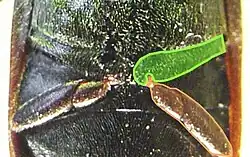 Abb. 3: Lacon punctatus Ausschnitt Unterseite Kopie unten teilweise koloriert blau: Umriss der Hinterhüfte; gelb: Teil des Hinterschenkels grün: Schenkeldecke rot: Rinne zur Aufnahme der Schenkel; |