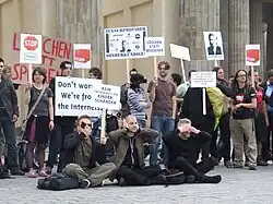 Demonstranten gegen Internetzensur mit symbolischen Scheuklappen (2009)Menschen mit einseitiger (eingeschränkter oder beschränkter) Sichtweise wird im deutschen (und im englischen) Sprachgebrauch im übertragenen Sinne auch vorgeworfen, „mit Scheuklappen herumzulaufen“.