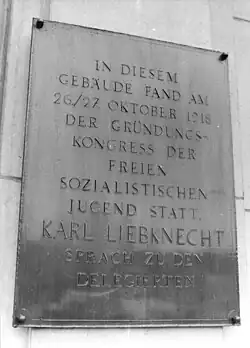 Lange Zeit befand sich in dem Bürohaus eine Gedenktafel, die den Besuchern verkündete, dass hier am 26./27. Oktober 1918 der Gründungskongress der FSJ stattgefunden und auf dem Karl Liebknecht zu den Delegierten gesprochen hatte.