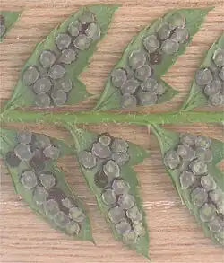 Die Sori liegen auf jedem Fiederabschnitt in je einer Reihe zwischen den beiden Blatträndern und der Mittelrippe. Sie sind rund und werden von einem rundlichen, schildförmigen Indusium bedeckt, welches bei manchen Arten sehr früh abfällt, bei anderen aber auch lang bleiben kann.
