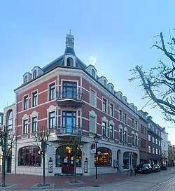 - Nr. 47: Dreigeschossiges historisierendes verklinkertes Wohn- und Geschäftshaus von 1907 (D) mit einem markanten quadratischen Ecktürmchen mit einer Laterne und einer Glockenhaube, mit Bäckerei und Café mit Jugendstilelementen. Architekt: Polack