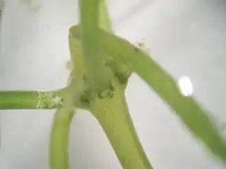 Gametangien werden im Sommer bis in den Dezember hinein gebildet und stehen in gestielten Köpfchen, kommen dort meist zu dritt vor und sitzen auf 1 bis 3 cm langen nach unten gebogenen Sprossen. Die Oogonien befinden sich unterhalb des farblosen, etwa 0,32 mm im Durchmesser großen Antheridiums, stehen zu 2 oder 3 zusammen, sind etwa 0,5 mm lang und 0,4 mm breit und weisen sieben bis acht Windungen auf. Die braunen Oosporen sind fast kugelig, etwa 0,3 mm im Durchmesser und weisen fünf oder sechs stark ausgebildete Rippen auf.