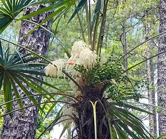 Der Blütenstand steht einzeln, zwischen den Blättern (interfoliar) und ist deutlich kürzer als die Blätter. Er ist meist zweifach verzweigt, selten dreifach. Der Blütenstandsstiel ist meist kurz. Die Blüten besitzen eine lange, stielartige Basis. Die unteren Blüten jeder blütentragenden Achse sind zwittrig, die oberen sind männlich. Die Anzahl der Staubblätter beträgt sechs pro Blüte. Der Fruchtknoten besteht aus einem Fruchtblatt.