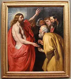 Grundlage der szenischen Darstellungen in der christlichen Kunst ist die Bibelstelle Mt 16,19: Ich will dir die Schlüssel des Himmelreichs geben: Was du auf Erden binden wirst, soll auch im Himmel gebunden sein, und was du auf Erden lösen wirst, soll auch im Himmel gelöst sein, in der Christus Simon Petrus nach dessen Bekenntnis von Caesarea im Kreis der Apostel symbolisch die sakramentale Macht des Bindens und Lösens verleiht. Früheste Beispiele stammen bereits aus spätkonstantinischer Zeit in Rom. Bis ins Mittelalter ist das Motiv oft begleitet von einer Darstellung der Gesetzesübergabe (traditio legis).[1] Später ist die Übergabe ein beliebter Bildvorwurf in der italienischen Renaissancekunst (Peruginos Fresko in der Sixtinischen Kapelle, 1481). Verständlicherweise gewinnt das Thema in der Gegenreformation und ihrer Verteidigung des päpstlichen Primats an Bedeutung (Bernini 1649, Rubens 1615). 1820 greift Ingres das Thema unter Benutzung raffaelesker Motive noch einmal auf.[2]