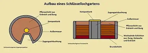 Ein Schlüssellochgarten ist ein rundes Hochbeet, das bei einem Durchmesser von ca. 3 Metern auf Hüfthöhe aufgeschichtet wird. Dabei wird die namensgebende Einbuchtung freigelassen, durch die der Gärtner Zugriff auf die Mitte des Gartens hat. Die Außenmauer wird aus Feldsteinen oder sonstigen geeigneten Materialien errichtet. Sie soll die Stabilität der Konstruktion gewährleisten und unerwünschten Einflüssen auf den Innenraum des Beetes, wie etwa größeren Temperaturschwankungen, entgegenwirken. Die Füllung des Beetes besteht aus abwechselnden Schichten von Holzasche, Dung und normalem Erdreich. Die unterste Schicht soll den Boden nach unten hin abschließen, um Wärme und Feuchtigkeit im Beet zu halten. Die verwendeten Materialien reichen von Aloe-Blättern bis hin zu plattgeklopften Konservendosen. Im Zentrum des Beetes befindet sich der „Korb“, in der Regel ein aus Stöcken und Gras gefertigtes Gestänge, das einen Freiraum bis zum Boden des Beetes offenhält. In diesen Freiraum können kompostierbare Materialien, etwa Küchenabfälle, gefüllt werden, die dem Boden Nährstoffe zuführen. Durch die filternden Eigenschaften des Korbes kann Brauchwasser aus dem Haushalt für die Bewässerung verwendet werden.[2][3]