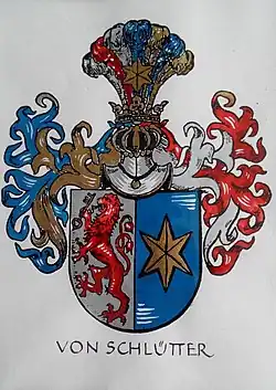 Johann Christian Schlüter (* 15. Januar 1655, † 2. August 1731, Kurfürstlich braunschweigisch-lüneburgischer Generalmajor und Chef des Kurhannoverschen Reuterregiments R 2-A) wurde 1725 in Wien vom Kaiser mit dem Namen von Schlütter in den rittermäßigen Reichsadelstand erhoben. Er war mit Anna Sabina von Klinggräff (* 6. November 1672, † 2. November 1714) verheiratet.[1]