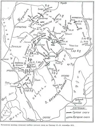 Am 6. Oktober 1915, weniger als ein Jahr nachdem Serbien (damals Königreich Serbien) den ersten alliierten Sieg des ersten Weltkriegs errungen und die Dritte Armee Österreich-Ungarns gedemütigt hatte, begannen die elfte deutsche Armee den vierten Einmarsch in Serbien.[1] Die überwältigende Überlegenheit bei der schweren Artillerie sowie das zahlenmäßige Gewicht überwältigten die serbische Armee schnell, die nach Süden in Richtung Kragujevac und Niš strömte. Fünf Tage später wurden die Serben überrascht, als die Erste und Zweite bulgarische Armee von Osten her in Serbien eindrangen, die Eisenbahnlinie von Saloniki nach Norden unterbrachen und Serbien der Verstärkung und Artilleriemunition beraubten. Das serbische Oberkommando sah sich gezwungen, seine so wichtige zweite Armee von der Nordfront zu verlegen, um diese Grenze zu verteidigen. Trotz einer zähen Verteidigung, die den Feind dazu brachte, langsamer als erwartet vorzurücken, zwang der Druck von Österreich-Ungarn, der Deutschen und der bulgarischen ersten Armee im Norden und der aus dem Osten vorrückenden bulgarischen zweiten Armee die Serben zum Rückzug in südwestlicher Richtung in den Kosovo. Das Ziel der deutschen Armee war es, die serbische Armee einschließen und zerschlagen, um den Zugang zu den Balkanverbündeten zu sichern.