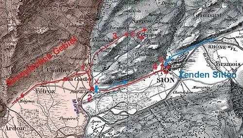 Am Morgen des 13. November stiess die Hauptmacht der Savoyer (1.) über den Grenzfluss Morge und schlug nach einem kurzen Gefecht (2.) die Vorhut der Walliser in die Flucht. Im gleichen Zuge stiess eine kleinere Truppe der Savoyer (3.) über die linke Flanke nach Savièse vor, schlug die Verteidiger und plünderte und brandschatzte die Dörfer. Das Hauptheer rückte nun gegen die Stadt Sitten (Sion) vor und drang in die westlichen Teile der Stadt ein (4.). Der nun eintreffende Landsturm der Zenden konnte die Savoyer wieder aus der Stadt vertreiben.