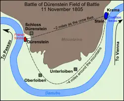 Das Schlachtfeld liegt in einem Talkessel, begrenzt von zwei Engstellen bei Dürnstein und Rothenhof; es ist umgeben von steil abfallenden Bergen auf der einen und der Donau auf der anderen Seite. 1805 führte die Straße von Dürnstein in der Mitte des Tales, ohne die beiden Loiben zu berühren. Das Tal war mit Weingärten bepflanzt. Diese waren mit Steinmauern umsäumt, die für Fuhrwerke und Artillerie ein Hindernis darstellten. Die Wege waren bereits vereist.