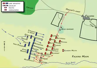 Generalleutnant Henry Hawley, der nach der Niederlage der britischen Regierungstruppen bei Prestonpans General John Cope als Oberbefehlshaber der britischen Regierungstruppen in Schottland abgelöst hatte, marschierte mit insgesamt etwa 7.000 Mann aus Edinburgh heran. Am 17. Januar 1746 beobachteten die Vorhuten der Regierungsarmee, wie sich die von Lord George Murray geführten Jakobiten mit etwa 5.000 Mann auf dem Falkirk Muir zum Kampf aufstellten, einer ebenen Fläche südwestlich des Ortes. Hawley wurde aus seinem Quartier geholt und ritt so eilig in das Lager der Regierungstruppen, dass er vergaß, seine Serviette abzunehmen. Das Wetter war sehr schlecht, es regnete und war dunkel.