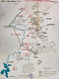 Mitte August begann der Angriff der russischen Truppen mit dem Ziel, die deutsche 8. Armee zu umfassen und zu vernichten. Die 1. russische Armee drang bereits am 17. August 1914 auf einer Breite von 40 km zwischen Wischtynjez und Schirwindt (nördlich der Rominter Heide) in Ostpreußen ein. Hier kam es noch am selben Tag zum Gefecht bei Stallupönen mit dem I. Armee-Korps unter General Hermann von François. Maximilian von Prittwitz formierte seine Armee nördlich der Masurischen Seen entlang der Angerapp. Hier wollte er die russischen Verbände anlaufen lassen und sie dann von beiden Seiten umfassen. Lediglich das XX. Armee-Korps unter General Friedrich von Scholtz sollte die südliche Grenze Ostpreußens sichern.
