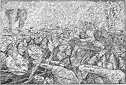 Die norwegische Flotte sammelte sich nach Snorri mit 180 Schiffen bei Hallkjellsvik im Voldafjord, südöstlich der Insel Hareidlandet. Als die Nachricht kam, dass die dänische Flotte nordwärts segele, rückte die norwegische Flotte nach Hjørungavåg vor und erwartete dort den Gegner. Nun überlagert die Heldendichtung die Ereignisse so stark, dass sich nichts geschichtlich festmachen lässt. Nach der Tradition aus der Zeit um 1200 gewannen die Jómswikinger in der ersten Phase der Schlacht die Oberhand. Die Wende kam erst mit dem nun einsetzenden Unwetter. Nach Þorkell Gíslason[31] und Fagrskinna sollen die Hagelkörner ein Öre (= 27 g) gewogen haben. Þorkell,[32] Bjarni,[33] der Mönch Oddr und Saxo[34] sind sich darin einig, dass das Unwetter durch Zauberei, zumindest durch die Hilfe heidnischer Götter ausgelöst worden sei. Bjarni und der Mönch Oddr kennen dazu Näheres: Es ist von einem magischen Opfer Håkon Jarls die Rede, nämlich dass er seinen siebenjährigen Sohn der Ahnfrau des Jarlsgeschlechtes Þorgerð opferte, so dass diese mit einer Schar Walküren ein großes Unwetter mit Schneesturm über den Kampfplatz hervorrief, dem die Feinde nicht gewachsen waren. Saxo lässt ihn zwei Söhne opfern, um ihn dann moralisch umso schärfer verurteilen zu können. Gro Steinsland bemerkt dazu, dass Menschenopfer zu dieser Zeit nicht üblich waren und daher der Bericht eine literarische Überhöhung der Opferbereitschaft des Jarls darstelle.[35] Sicher ist aber offenbar, dass Håkon Jarl am Ende die Schlacht gewann. Der Verfasser der Fagrskinna glaubt offenbar nicht an die Zauberei und das Eingreifen heidnischer Götter, sondern lässt es beim Unwetter bewenden. Auch Snorri ist skeptisch: „Das ist das, was das Volk sagt.“ Man kann sogar das Hagelwetter selbst in Zweifel ziehen. Denn der zeitgenössische Dichter Tindr Hallkelsson verwendet die übliche Formulierung für den Schauer von Pfeilen, der dicht über dem Feind niederging, „Kampfsturm“ und „Odins Unwetter“. Knut Helle hält es für möglich, dass spätere Erzähler der mündlichen Überlieferung diese Formulierung zum wirklichen Hagel überhöht haben.[34]