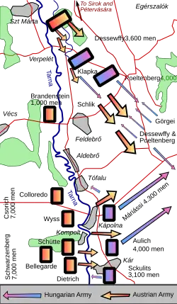 Um die Konzentration der ungarischen Armee zu verhindern, hatte der kaiserliche Feldmarschall Fürst Windisch-Grätz etwa 30.000 Soldaten und 165 Geschütze zusammengezogen. Er wollte Mitte Februar 1849 die Vereinigung seiner Armee mit dem im Raum Eger exponiert stehenden Korps Schlik herstellen. Derweil verblieb das kroatische Korps unter Ban Jellacic zwischen Pesth und Szolnok aufgestellt, um die Armee Windisch-Grätz gegen die ungarische Südarmee zu decken.
