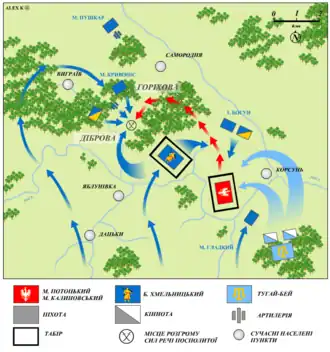 Die Truppen der Kosaken und Tataren griffen die in Verteidigungsstellung befindlichen polnischen Truppen an und brachten diesen eine vernichtende Niederlage bei,[2] woraufhin der Aufstand des Bohdan Chmelnyzkyj zu einem Krieg eskalierte.[3]