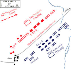 Die Schlacht bei Lützen war eine der Hauptschlachten des Dreißigjährigen Krieges. Sie fand am 6. Novemberjul. / 16. November 1632greg. bei Lützen zwischen einem protestantischen, überwiegend schwedischen Heer unter Führung des schwedischen Königs Gustav II. Adolf und den überwiegend katholischen kaiserlichen Truppen unter Albrecht von Wallenstein statt. Für die Schweden endete die Schlacht mit einem Pyrrhussieg. Etwa 10.000 Soldaten, darunter General Gottfried zu Pappenheim und König Gustav II. Adolf, fanden auf dem Schlachtfeld den Tod. Herzog Bernhard von Sachsen-Weimar, der in der Schlacht die Führung übernommen hatte, blieb Befehlshaber der schwedischen protestantischen Truppen.