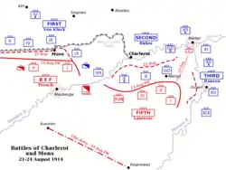 Die beiden Korps der BEF waren am Abend des 20. August 1914 gefechtsbereit im Raum östlich und südlich von Le Cateau versammelt. Die britische Kavalleriedivision stand nordostwärts bei Maubeuge an der belgischen Grenze, einzelne Kavalleriepatrouillen waren auf belgischem Gebiet bis über Mons hinaus vorgerückt, ohne auf deutsche Truppen zu treffen. Die BEF bildete den äußersten linken Flügel des Aufmarschraumes der Entente-Truppen. Der Befehlshaber des Verbandes, Feldmarschall French, entschloss sich, mit dem 21. August beginnend in nordöstlicher bzw. nördlicher Richtung auf Mons vorzurücken, um einer befürchteten Überflügelung durch deutsche Truppen zu begegnen. Der französische Oberkommandierende Joffre bat die Briten kurz darauf, sich der allgemeinen Offensivbewegung der französischen 3., 4. und 5. Armee anzuschließen nach Soignies, 15 Kilometer nordöstlich von Mons, zu marschieren. Im Süden dieser Stadt trafen am Vormittag des 22. August britische und deutsche Kavalleriepatrouillen aufeinander. Dies und zahlreiche Aufklärungsmeldungen überzeugten den britischen Befehlshaber vom Nahen starker deutscher Verbände aus Richtung Brüssel. Er entschied, den eigenen Vormarsch zu stoppen und den Deutschen in den erreichten günstigen Positionen von Thieu entlang des Canal du Centre bis Nimy und von da am Mons-Condé-Kanal entlang bis Thulin, Frontbreite etwa 30 Kilometer[7][8] zu begegnen. Die Truppen hoben auf der Südseite der Kanäle Schützengräben aus oder verbarrikadierten sich in den dicht stehenden Wohn- und Industriebauten. Das nördlich der Kanallinie gelegene, gut für die Verteidigung einzurichtende Tertre wurde ebenfalls besetzt.