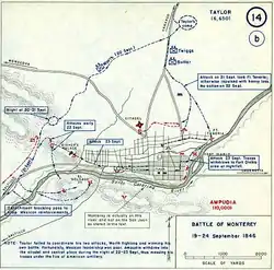 ![]() Darstellung der Kämpfe um Monterrey. Mit Palace Hill ist vermutlich der Obispado gemeint. | |||||||||||||||||