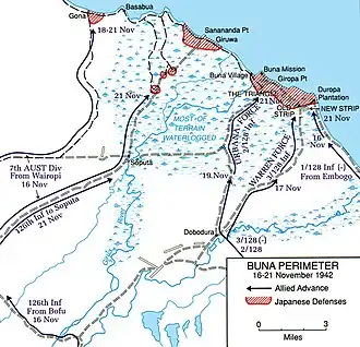 Die alliierten Truppen rückten am 16. November vor, die 32. Division gegen Buna und die 7. Division gegen Gona und Sanananda. Einheiten auf beiden Seiten der Grenze zwischen den Divisionen sollten besonders darauf achten, ihre innere Flanke nicht freizulegen. Die 32. Division sollte zusätzlich zu ihrer Kampfrolle eine Landebahn in Dobodura errichten, die Überquerung des Flusses Girua in der Nähe von Soputa sichern und halten und für die Sicherheit der rechten Flanke vor feindlichen Angriffen auf See sorgen[6].