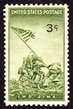 Das berühmte Foto Raising the Flag on Iwo Jima inspirierte eine Briefmarke, die der United States Postal Service im Juli 1945 herausbrachte, und das United States Marine Corps War Memorial.