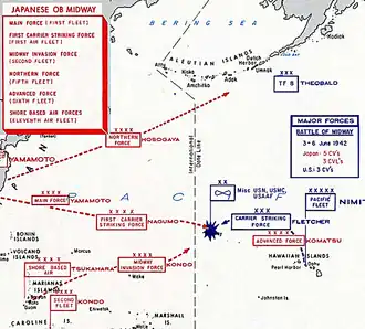 Die Japaner setzten den Trägerkampfverband Kidō Butai von Vizeadmiral Nagumo Chūichi mit vier Flugzeugträgern, dem Flaggschiff Akagi, der Kaga, der Hiryū und der Sōryū, in Richtung Midway in Marsch. Etliche hundert Meilen hinter diesen kamen die Schlachtschiffe des Oberkommandierenden Admirals Yamamoto Isoroku. Aus südwestlicher Richtung näherte sich die dritte japanische Welle unter Vizeadmiral Kondō Nobutake. Mit seinen Zerstörern und Kreuzern bildete er die Invasionsflotte für Midway. Allerdings fehlten Yamamoto zwei seiner Flugzeugträger, die er dringend vor Midway gebraucht hätte: Der Träger Shōkaku war in der Schlacht im Korallenmeer schwer beschädigt worden, während die Zuikaku einen Großteil ihres Bordgeschwaders verloren hatte. Zwei weitere Träger (Jun’yō und Ryūjō) waren zu einem Ablenkungsangriff im Nordpazifik abgezogen worden, um den Angriff auf die strategisch wertlosen Aleuten zu unterstützen. So konnte Yamamoto mit nur vier großen Trägern den Angriff auf Midway starten.