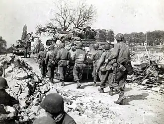 ![]() Soldaten der 3. US-Infanteriedivision der 7. US-Armee dringen am 16. April 1945 von Norden her nach Nürnberg ein. | |||||||||||||||||