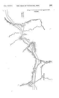 Grant befahl am 25. Mai den Kommandierenden Generalen, mit der Belagerung zu beginnen. Dabei sei es wünschenswert, keine Menschenleben mehr zu verlieren. Gleichzeitig befahl er Gräben so anzulegen, dass Artillerie nach vorne gebracht und Minen unter den konföderierten Stellungen gezündet werden konnten. Die Leitung dieser Arbeiten übertrug er den Pionieroffizieren der Kommandos.[20] Am 26. Mai begannen die Bauarbeiten. Bis zu 300 Soldaten waren gleichzeitig beim Bau eines Annäherungsgrabens eingesetzt. Die Sappen verliefen im Zickzack auf die gegnerischen Stellungen zu. Sie waren ungefähr 2,40 m breit und 2,10 m tief. Artilleriegeschütze konnten so in Deckung nach vorne gebracht werden. Ausgediente Eisenbahnwaggons, auf denen Baumwollballen befestigt waren, dienten den grabenden Soldaten als Sichtschutz. Insgesamt legte die Tennessee-Armee neun Annäherungsgräben an.[21]