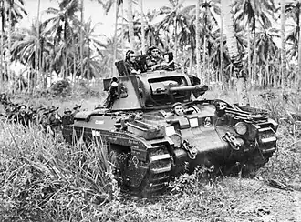 ![]() Ein Matilda-Panzer namens Clincher beim Marsch auf japanische Positionen bei Finschhafen, 9. November 1943 | |||||||||||||||||