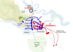 Die Schlacht von Bannockburn am 23. und 24. Juni 1314 war eine der entscheidenden Schlachten in den Schottischen Unabhängigkeitskriegen des späten 13. und des 14. Jahrhunderts. Im Sumpfland von Bannockburn in der Nähe von Stirling errang das schottische Heer unter der Führung von Robert (the) Bruce einen entscheidenden Sieg gegen ein erheblich größeres englisches Heer unter Eduard II.[7]