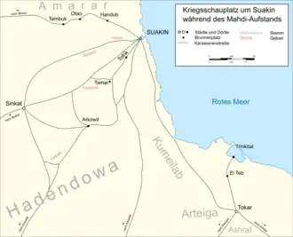 - ↑ Fergus Nicoll: Gladstone, Gordon and the Sudan Wars: The Battle Over Imperial Intervention in the Victorian Age. 2013, ISBN 978-1-4738-2253-5, Chapter 5: ‘No end to our responsibilities’: „General Graham achieved his first resounding victory over the Mahdī’s army in the Red Sea Hills on 29 February 1884 at the ‘Place where Camels are Hobbled’, an oasis that retains its place in British military lore as ‘El Teb’. For the Sudanese, it was the ‘Third Battle of the Coast’, the first and second having been the attack on Sawākīn on 4-5 November 1883 [...], and ʿUthmān Diqna’s destruction of Valentine Baker’s force on 4 February 1884.“