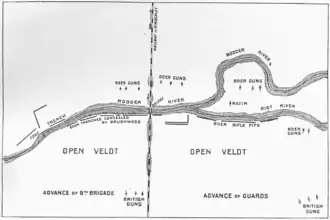 Die Kavallerie der Briten erkundete zwar während des Vormarsches der übrigen Truppen das spätere Schlachtfeld am Modder River, entdeckte aber die Schützengräben der Buren nicht, obwohl diese deutlich sichtbare Zeichen wie beispielsweise Konservenbüchsen oder gekalkte Steine als Entfernungsmessmarken auf dem Boden ausgelegt hatten.