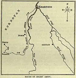 Zusammen mit einem weiteren Kontingent für das Expeditionsheer fuhren Hicks und sein komplett aus Europäern bestehender Stab am 7. Februar 1883 von Kairo nach Suakin, um von dort über Berber Khartum zu erreichen, wo sie am 7. März ankamen. Zuerst befriedete Hicks im April die Dschazira, das Gebiet zwischen dem Weißen und Blauen Nil, wo sich einige Stämme im Namen von Muhammad Ahmad unter der Führung von Ahmad al-Makashfi erhoben hatten. Darauf begann er mit der Planung zur Rückeroberung von Kordofan. Dafür verlangte er, aufgrund ständiger Meinungsverschiedenheiten mit dem eigentlich nur nominellen Oberbefehlshaber Sulayman Pascha Nyazi, von der ägyptischen Regierung die Ernennung zum Oberbefehlshaber des Expeditionsheeres und 6.000 Mann Verstärkung. Die ägyptische Regierung entsandte lediglich 3.000 Mann, die zumeist als untauglich für die in Reorganisation begriffene ägyptische Gendarmerie befunden wurden. Zum Oberbefehlshaber wurde Hicks Ende Juli ernannt, nachdem er mit dem Rücktritt gedroht hatte. Am 9. September 1883 verließ Hicks mit dem Expeditionsheer Khartum zur Rückeroberung von al-Ubayyid und der Provinz Kordofan.[3]