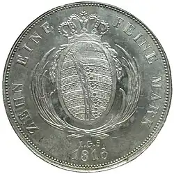 | Revers: Heraldisch tingiertes sächsisches Wappen in einem ovalen Wappenschild mit aufgesetzter Königskrone, beidseitig mit zwei Lorbeergirlanden geschmückt und mit zwei über Kreuz liegenden Palmzweigen eingefasst; zwischen deren Stielenden Münzmeisterzeichen I.G.S. Münzfuß als Umschrift von links beginnend „ZEHN EINE FEINE MARK“ und Jahreszahl | ||