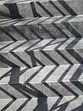 3. Der Untergrund beeinflusst das Aussehen des Schlagschattens. Das Geländer wirft ein zickzackförmiges Schattenmuster auf die Treppe. -