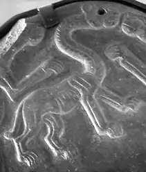 In einer weiteren Darstellung auf der Zwei-Hunde-Palette sind zwei Schlangenhalspanther zu sehen, wie sie wahrscheinlich eine Sonnenscheibe umranken. Ihre beiden Köpfe stoßen auf eine Gazelle nieder, um sie zu töten. Über dieser Szenerie schwebt ein Ba-Seelenvogel.[5]