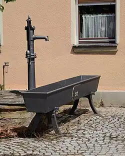 • Brunnen: gusseiserner Pumpschwengel mit Eisenwanne, bezeichnet „1880“; vor Haus Nr. 8[25]