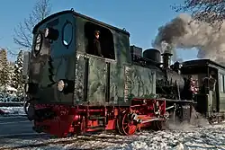 Ab 1877[7] wurde die Pferdebahn auf den Betrieb mit Dampflokomotiven umgestellt. In den ersten Jahren des Dampfbetriebs waren sie auf die Bedürfnisse der Strecke angepasst. Die Lokomotiven für den Schlackentransport der Hütte hatten zusätzliche Wassertanks. Auf der 4 km langen Strecke zur Schlackenhalde wurden zwei Kubikmeter Wasser verbraucht.[8] Später wurden B-Kuppler und vorwiegend Cn2t Maschinen von Henschel eingesetzt; sie unterscheiden sich durch die unterschiedlichen Achsfolgen und deren Antrieb.