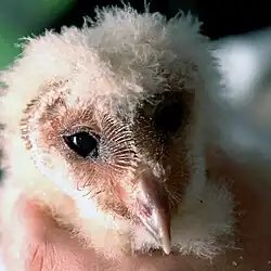 Die Nestlinge weisen im Unterschied zu anderen Eulen zwei aufeinanderfolgende Dunenkleider auf: Das erste Dunenkleid ist weiß und kurz. An den Halsseiten fehlt es fast ganz. Nach etwa zwölf Tagen folgt ein dichteres und längeres Dunenkleid, das an der Körperoberseite grau und an der Körperunterseite gelblich getönt ist. Die Augen öffnen sich ab dem achten Tag. Die Iris ist anfänglich blau und färbt im Verlauf von vier Wochen in ein Dunkelbraun um. Der Schnabel ist beim Schlupf weißlichrosa, nimmt aber sehr schnell eine graue Färbung an. Die Zehen sind anfangs rosagelb und haben bis zum Flüggewerden der Jungeulen eine dunkelgraue Farbe.[2]