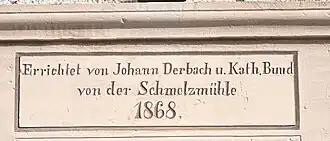 Die Inschrift über der Tür der Wegekapelle in Waldrach, Zollweg 68, lautet: Errichtet von Johann Derbach und Kath. Bund von der Schmelzmühle 1868. Siehe dazu auch die Liste der Kulturdenkmäler in Waldrach.