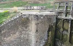 Erhöhung um Δh beim Anschluss der Treppe an den Brückenkanal über den Orb, im Hintergrund das Absperrtor gegen den Brückenkanal der ebenfalls erhöhten Kammer 7