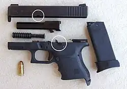 Nur der Schlittenfang am Schlittenfanghebel gewährleistet das sichere Ablegen der Pistole im Zustand „gesichert, entladen, mit offenem Verschluss“. Die Pistole ist in diesem Zustand durch manuell oder automatisch wirkende Sicherungen gesichert, das Magazin ist entfernt und das Patronenlager geleert, der Verschluss befindet sich in geöffneter Position. Die Pistole ist mit dem Auswurffenster nach oben abgelegt. Sicherheitspersonal oder der Schütze selbst sind in der Lage, den Zustand der Waffe mit einem Blick festzustellen.