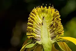 In einem Blütenkörbchen stehen acht bis zwölf Zungenblüten (Strahlenblüten) und 150 bis über 300 Röhrenblüten (Scheibenblüten) zusammen. Die goldgelben Zungenblüten weisen eine Länge von 1,5 bis 5 Zentimetern und eine Breite von 4 bis 14 Millimetern auf und werden später zurückgeschlagen. Die gelben bis gelblich-grünen (olivgrünen) Röhrenblüten weisen eine Länge von 9 bis 30 Millimetern und einen Durchmesser von 10 bis 23 Millimetern auf, mit gelben 3,5 bis 5 Millimeter langen Kronlappen. Die Griffeläste weisen eine Länge von 1 bis 1,5 Millimetern auf.