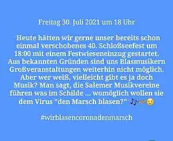 Zum Festtermin 2021 veranstalteten die Salemer Musikvereine, anstelle des Festwieseneinzugs, einen Flashmob-ähnlichen Sternmarsch aus allen Himmelsrichtungen, zu einem spontanen Platzkonzert vor dem Rathaus, unter dem Motto „Wir blasen Corona den Marsch“.[41]