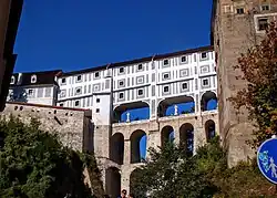 Schloss Krumau (tschechisch Zámek Český Krumlov) ist ein Renaissance-Schloss im böhmischen Český Krumlov (deutsch Krumau). Mit rund 225.000 Besuchern im Jahr 2024 ist es eines der meistbesuchten Schlösser Tschechiens.[1] Es entwickelte sich aus einer Burg, die um 1240 vom Krumauer Familienzweig der Witigonen errichtet wurde. Das gesamte Areal wurde 1989 zum Nationalen Kulturdenkmal erklärt und 1992 in das Verzeichnis des Welterbes der UNESCO aufgenommen.