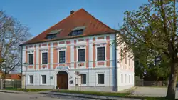 „zweigeschossiger Walmdachbau mit Kniestock und reichen Putzgliederungen, errichtet 1704 als Pflegamtssitz, 1775 Umbau zum Jagdschloss mit Aufstockung, nach Brand 1810 oberes Geschoss abgetragen, ab 1860 Institut der Englischen Fräulein, jetzt Kindergarten.“
