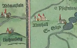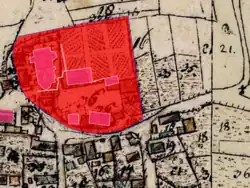In dem Stich von Michael Wening von 1726 wird neben der Kirche ein Adelssitz festgehalten. Dieser besteht aus einem zweistöckigen Gebäude mit zwei Treppengiebeln und einem Satteldach; links davon steht der ehemalige Pfarrhof. Rechts davon befindet sich ein längliches Wirtschaftsgebäude. Das Ensemble wurde bei einem Brand von 1782 beeinträchtigt, wobei der ehemalige Pfarrhof zerstört wurde. Das Gelände ist von einer Hofmauer umgeben, durch die ein Bogentor führt; diese Mauer mit dorischer Säulenordnung und Dreiecksgiebel wurde nach 1782 erneuert und besteht heute noch. Der alte Pfarrhof und das landwirtschaftliche Gebäude existieren hingegen nicht mehr, sodass das jetzige Gebäude, abgesehen von zwei kleinen Gebäuden nahe der Einfahrt, frei in dem Hof steht.