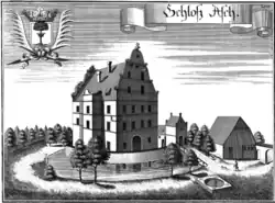 „Ehemaliges Wasserschloss Asch, ungegliederter dreigeschossiger Bau mit Halbwalmdach, nach 1541.“